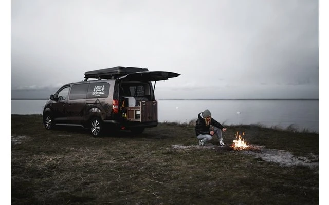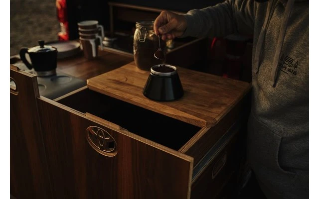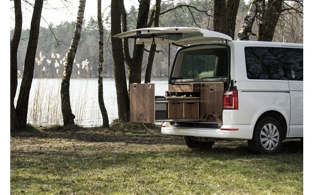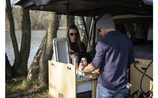 Die Box-Küche ist mit einem zweiflammigen Gasherd für 4 Kartuschen, einem Kompressor-Kühlschrank, der auch als Gefrierschrank verwendet werden kann, ausgestattet.